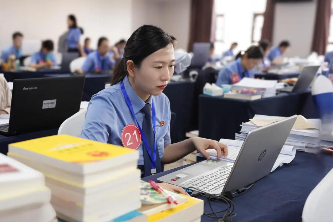 综合知识测评结束后,长达9小时的法律文书制作环节随即展开。选手们面前的参考资料堆叠如丘,材料文件被反复翻阅、标注。有人俯身凝视案件材料,用笔圈出争议焦点;有人专注于键盘,将审查思路转化为条理清晰的审查终结报告;有人对着屏幕逐字核对,确保法律引用精准无误。从晨光初露到夕阳西斜,考场内始终保持着高度专注,每一份文书的打磨,都透着对司法规范的敬畏与严谨。