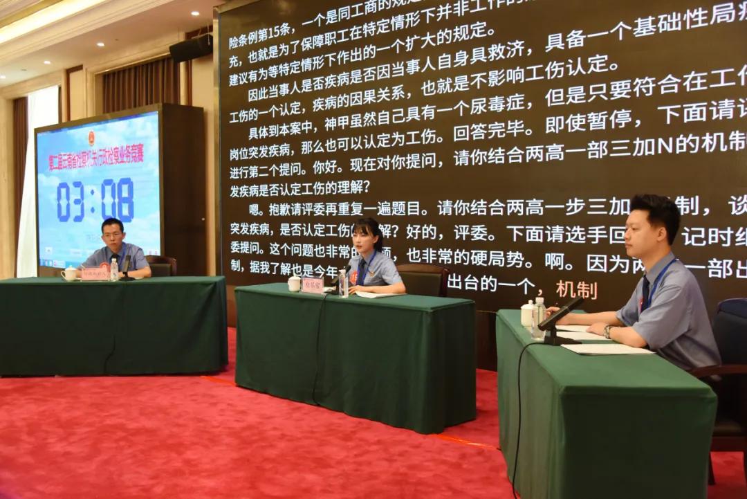 “当事人的基础性疾病是否影响‘视同工伤’认定?”“结合两高一部‘3+n’的机制谈一谈你对在家突发疾病是否认定工伤的理解。”“如果认定‘视同工伤’,48小时的起算时间如何确定?”面对评委的提问,选手们或引用《工伤保险条例》条款,或结合法理逻辑,在角色框架内沉着应对。