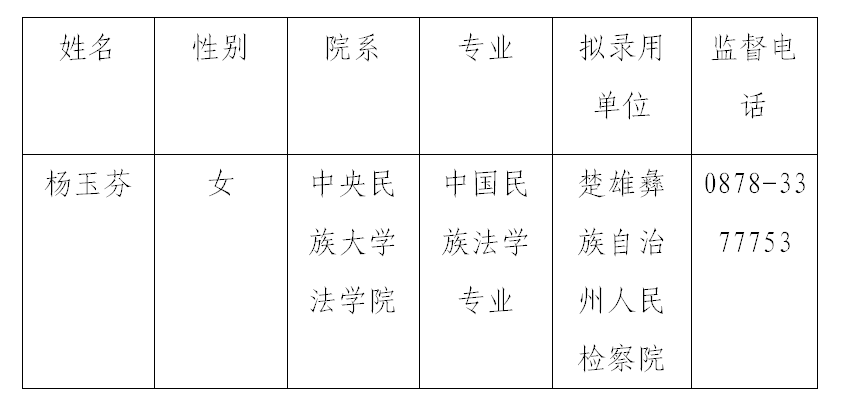 按照公务员法和公务员录用相关规定,经过笔试、面试、考察、体检、档案复核等工作程序,拟录用杨玉芬同志为楚雄彝族自治州人民检察院