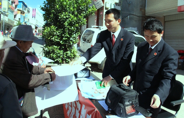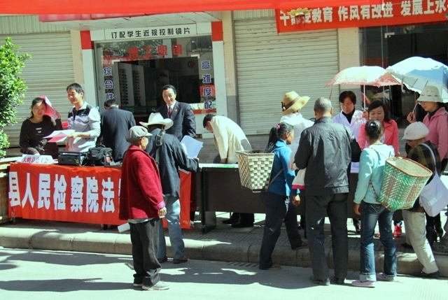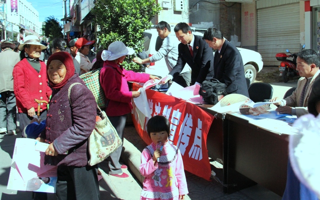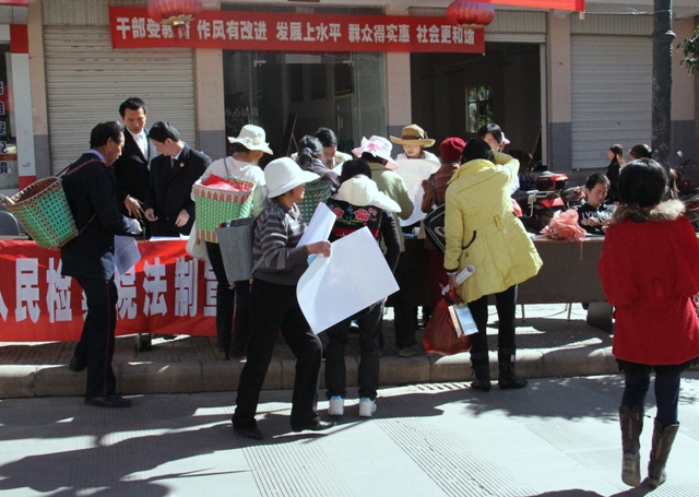 大姚县人民检察院预防职务犯罪科、民事行政检察科、控告申诉科、团支部结合全国“12.4”法制宣传日活动、“六五”普法等法制宣传,于2012年12月2日利用赶集日走上县城街头,设立“法制宣传点”开展法制宣传和提供法律咨询服务。广泛宣传人民检察院受理控告申诉案件的程序和举报方式;不服民事、行政判决申诉案件的受案程序、受案范围及抗诉条件;职务犯罪预防等方面的职能和作用。发放宣传材料1000余份,提供法律咨询服务19人次。