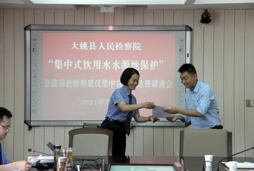 为切实将习近平总书记关于城乡居民饮水安全的重要指示精神贯彻落实到检察工作中,结合“我为群众办实事”实践活动,充分发挥公益诉讼检察职能,推动水源地保护攻坚战向纵深发展。5月14日,大姚县人民检察院召开了“集中式饮用水水源地保护”行政公益诉讼检察建议集中宣告送达暨磋商会。大姚县水务局、环保局以及全县12个乡镇的分管领导参会,会议邀请了县人大代表、政协委员、人民监督员参加。