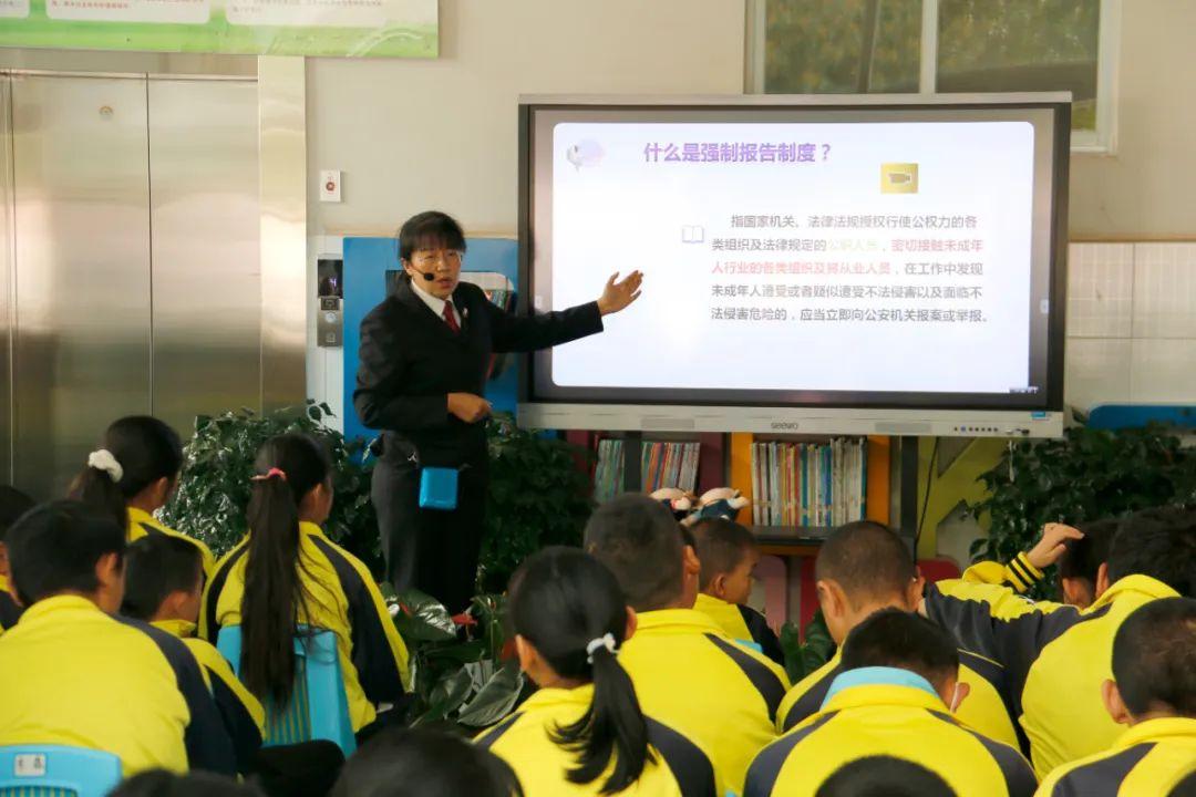 检察官结合学生们的身心健康特点,从实际出发,用通俗易懂的语言深入浅出地从宪法相关知识入手,从宪法的概念和意义切入,详细阐述了我国宪法的发展历程,通过一个生动的小视频着重讲解了宪法如何伴随公民的一生,使同学们对宪法规定的公民基本权利和义务有了更加全面、深入的了解。同时,把法律知识融入问答,将自我保护融入游戏,用一问一答的互动、动画视频和讲故事等方式,辅之以布偶娃娃演示,吸引孩子们注意力,寓教于乐,将防性侵、防拐骗、防欺凌、防性侵、交通安全等自我保护的知识贯穿其中,教会孩子们遇到困难和挫折要勇敢面对,遇到不法行为要向父母、老师等自己信任的人寻求帮助,勇敢拿起法律武器保护自己。同时,检察官围绕未成年人权益保护、侵害未成年人案件强制报告制度等内容,对教职员工们进行了宣讲,强调了建立侵害未成年人案件强制报告制度的重要性,督促学校和家长严格遵守强制报告制度,为学生在学校健康阳光快乐地学习和成长营造安全稳定的校园环境。