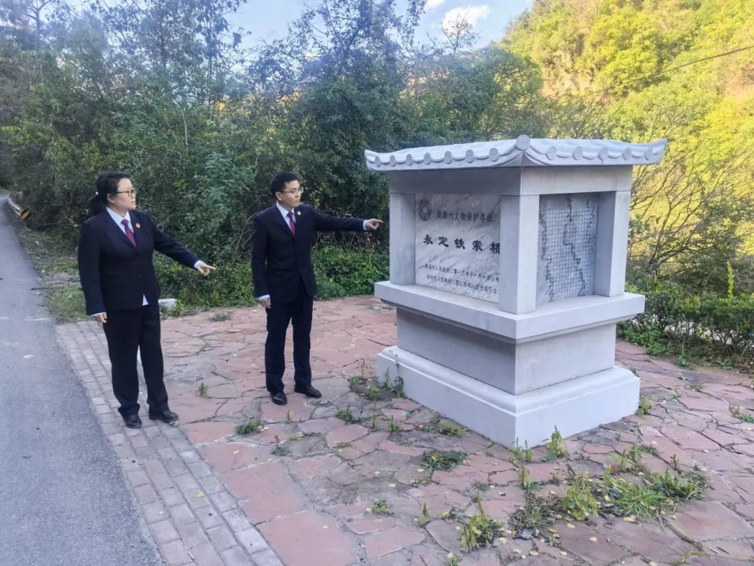 位于禄丰市广通镇几子湾村委会堵米村南龙川江之上的永定铁索桥始建于 1916年,曾经是广通至牟定驿道要梁,也是禄丰黑井、琅井运盐咽喉要道,是禄丰市境内保存较为完整的古代铁索桥、珍贵的实物之一,具有较高的历史、艺术、科学和观赏价值, 2013年被列为州级文物保护单位。禄丰市检察院检察官在走访中了解到,永定铁索桥因年久失修,桥面挡板残缺,扶手钢绳吊杆缺失,桥墩周围杂草丛生,且周围无文物标识说明。