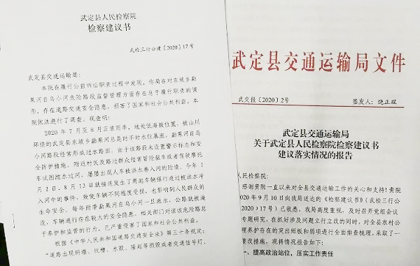武定县人民检察院第三检察部随即向武定县交通运输管理局发出诉前检察建议,要求该局依法履行交通运输监管职责,对东坡乡勐果河自乌小河危险路段规范设置道路交通安全标识,确保行车和群众通行安全。同时,加大隐患排查力度,对本县及乡镇辖区内道路交通配套设施不健全、安全防护设施未设置的路段进行全面排查和整治,联合相关部门及时完善交通安全配套设施建设和管护,提升道路安全畅通能力,方便群众生产生活,维护国家和社会公共利益。