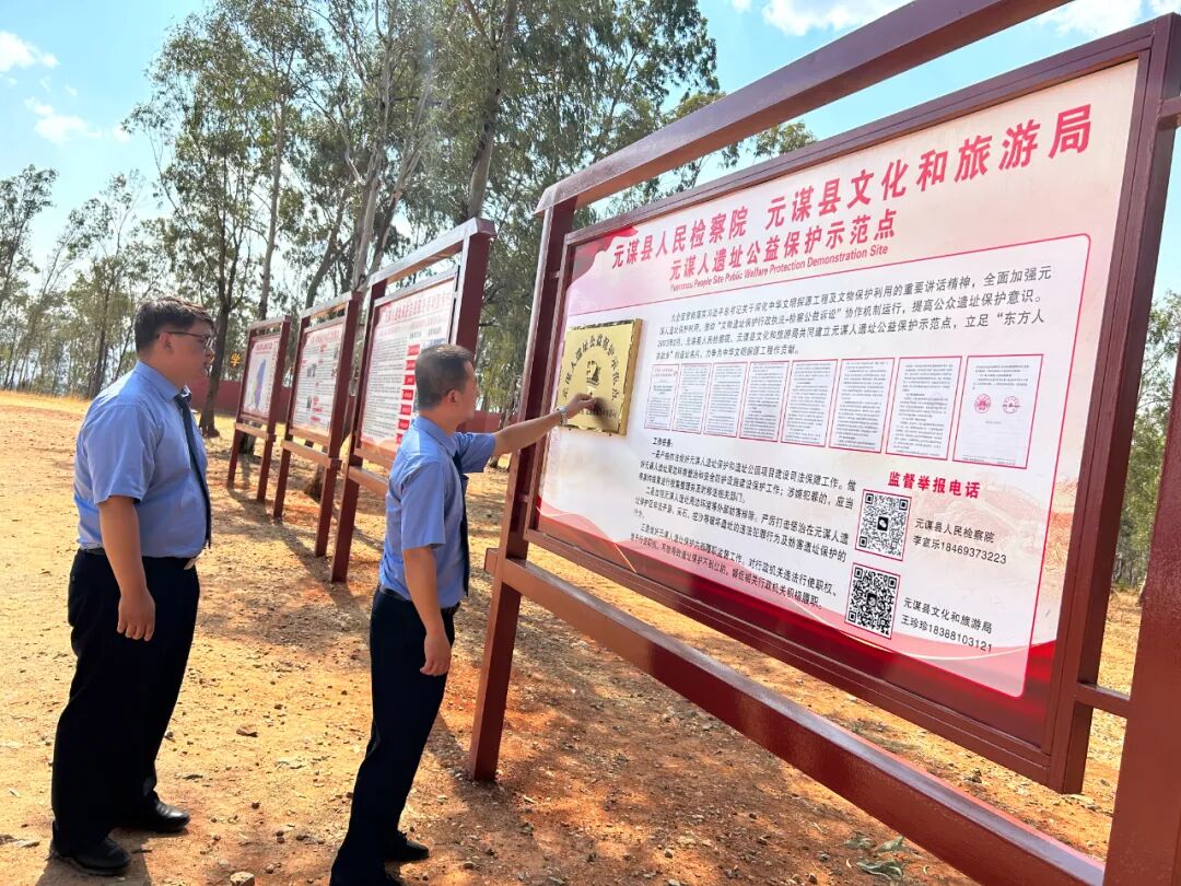 2020年5月,元谋县检察院对履职中发现元谋人遗址存在保护管理不到位的情形,向两家行政机关制发检察建议书,督促其依法履行职责。行政机关及时进行整改,增聘元谋人遗址管护人员3名,加强人员力量并强化管理培训;更换、修复毁损的103棵界桩及铁丝网;常态化将消防水池蓄满水,保障消防用水;对遗址保护区内13冢坟墓进行迁出;在遗址保护区重要位置制作、树立了9块文物保护公告警示牌,在周边村组召开文物保护宣讲大会,营造好文物保护人人有责的良好氛围,元谋人遗址得到了有效保护。