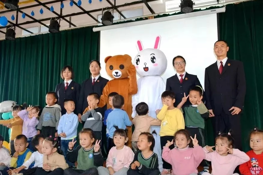 为了让年龄小、理解能力有限的幼儿园小朋友学懂法律、树立规则和自我保护意识,青年干警们穿上玩偶服,扮演成“小熊和小兔”,从小熊和小兔因为争抢玩具发生推打的故事中,让小朋友们明白了不能损坏他人财物、不能伤害他人身体,从而认识了财产权、健康权、人格权等法律概念。