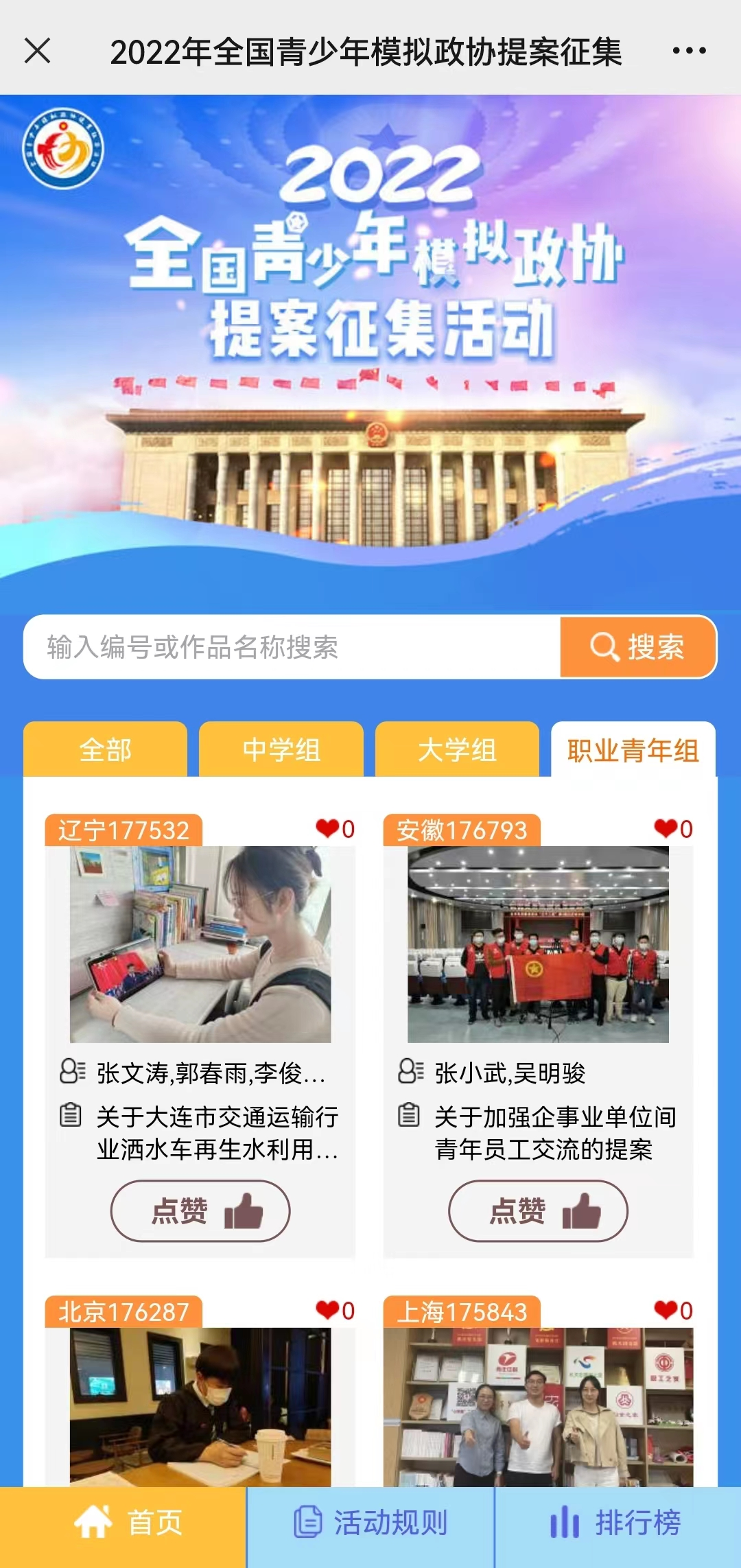 1. 活动期间,每名用户最多可为每个组别中的2个模拟政协提案作品各点赞1次,即最多点赞6次。