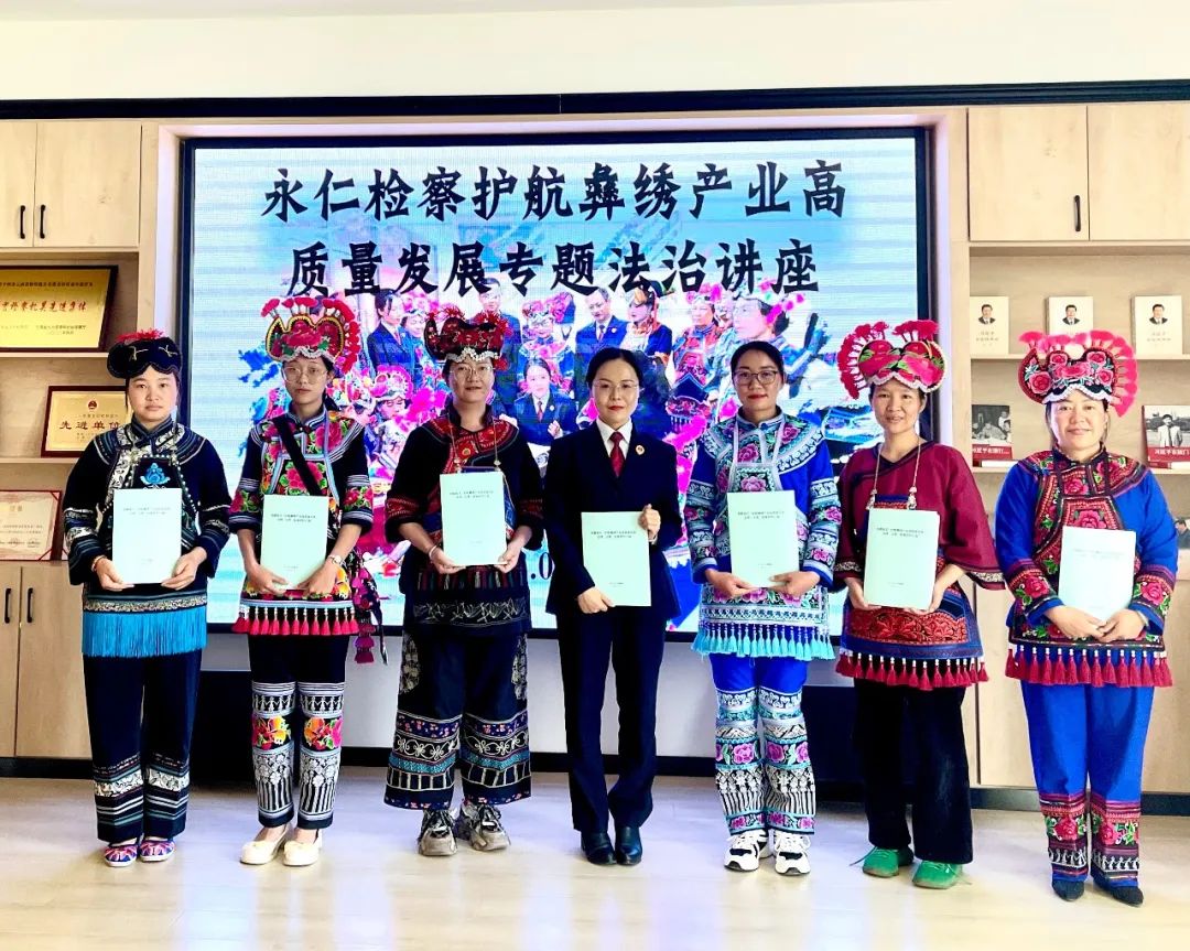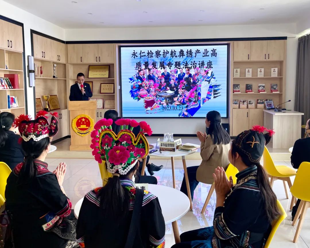 永仁县市场监督管理局相关负责人黄明燕讲授了关于外观设计专利申请、商标注册等方面的专业知识。永仁县检察院第一检察部副主任李文凤从彝绣的非遗传承、知识产权保护及绣娘的权益保护三个方面讲授了彝绣的非遗传承与知识产权保护相关法律知识。