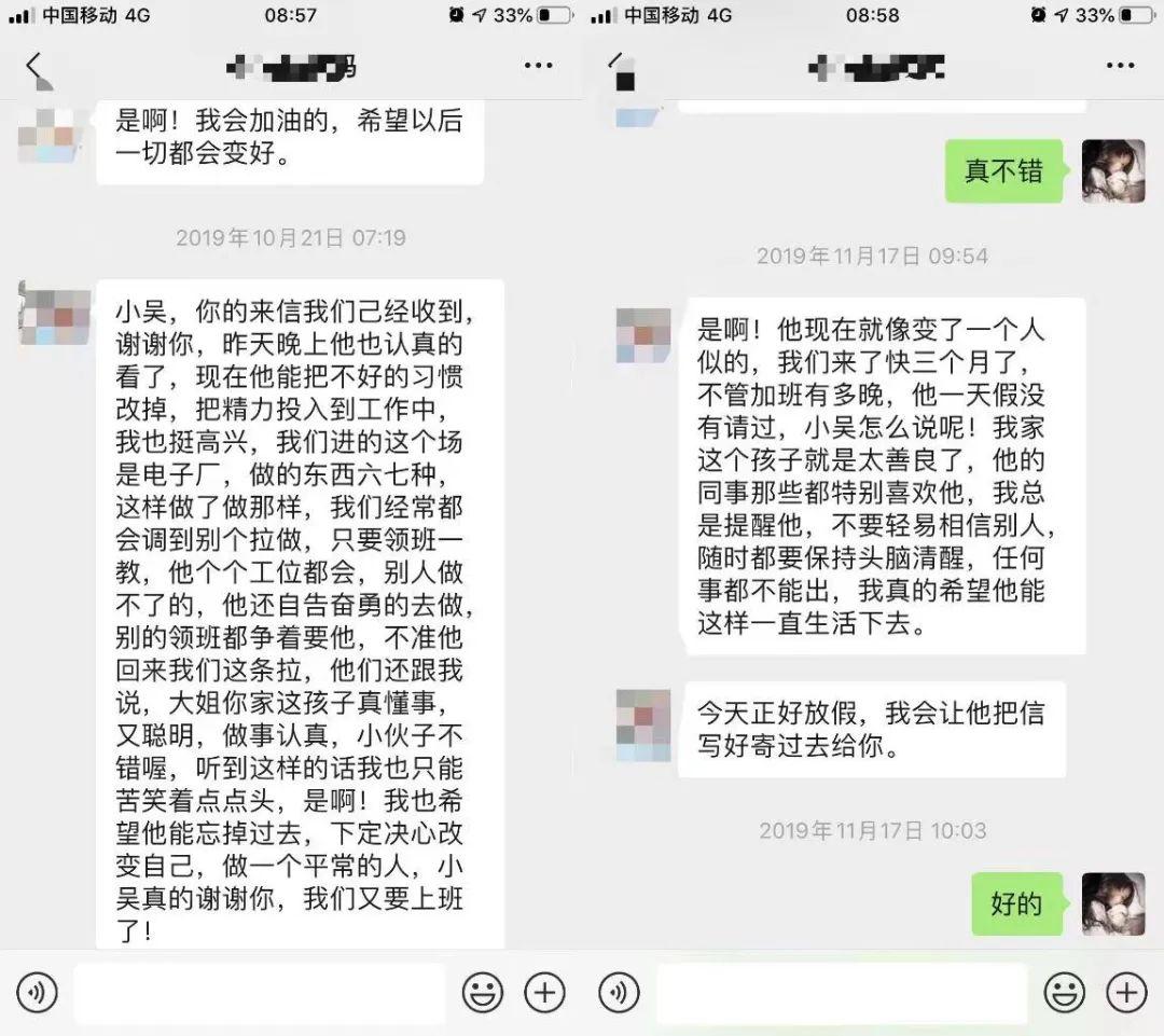 后来,小新的母亲带着小新到了广东的一家电子厂上班。小新的母亲白天与小新在一条生产线上班,晚上一起住在出租屋。我定期给小新写信,鼓励其重拾信心,努力工作,做一名遵纪守法、对社会有用的人。我还经常打电话给小新的母亲,鼓励她对小新要有信心,并教授一些教育的方式方法。
