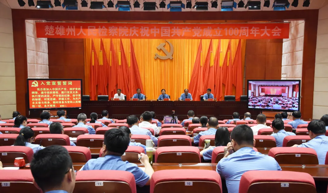 2021年6月30日上午,楚雄州人民检察院召开庆祝中国共产党成立100周年大会,院党组书记、检察长肖洁,院领导班子成员,机关全体检察人员,派驻纪检监察组全体成员,老干部老党员代表,共驻共建社区代表共计120余人齐聚一堂,共庆党的生日、同悟党的历史。院党组成员、副检察长李光俊主持会议。
