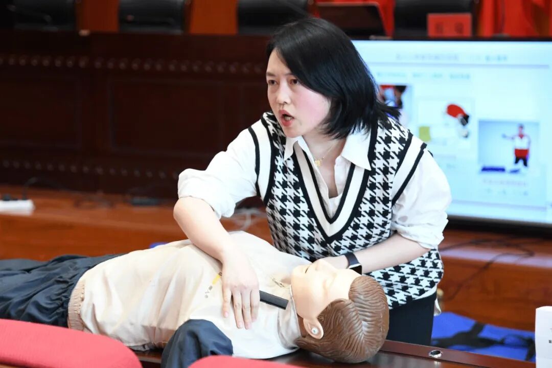 培训中,杨瑞讲师采用现场示范、互动的方式,为大家讲解突发疾病的预防和应急救护方法,并现场示范心肺复苏术、海姆利克急救法、自动体外除颤仪(AED机)的操作流程和技术要领。现场检察干警和相关工作人员积极与讲师沟通互动,并参与实操练习。
