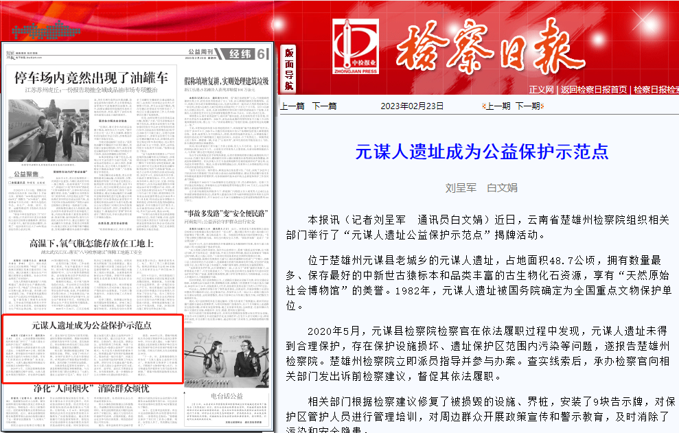 为推进常态监管和长效保护,元谋县检察院积极延伸检察职能,与文旅等相关部门联合挂牌设立“元谋人遗址公益保护示范点”,制定《关于建立加强元谋人遗址公益保护协作工作实施方案》,建立信息共享、线索移送、办案协作、联合巡查、联席会议、宣传预防等工作机制,构建“文旅行政执法+检察公益保护”协作新模式;充分运用大数据和新媒体平台,探索遗址遗产宣传保护监督新模式,推动形成一批历史遗产、民族文化、生态资源司法保护检察工作亮点品牌,讲好历史文化遗址遗产故事;加大元谋人遗址公益保护宣传力度,进乡村、进学校、进社区开展普法宣传,发布典型案例,进一步增强社会公众文物和文化遗址的保护意识。