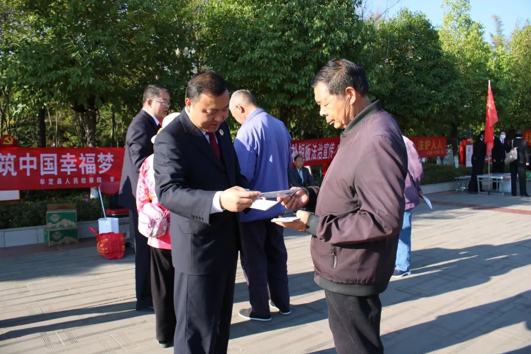 在牟定化湖广场,牟定县检察院设立咨询台发放宣传资料、悬挂宣传横幅,为过往群众进行答疑释法。