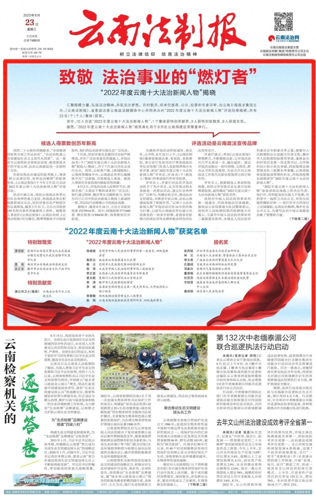 汇聚楷模力量,弘扬法治精神,共筑法治梦想。历时数月,经单位推荐、公示、投票和专家评审,由云南日报报业集团主办,《云南法制报》、省委政法委云南政法融媒体中心共同承办的“2022年度云南十大法治新闻人物”评选结果揭晓,共有23名(个)个人(集体)获奖。