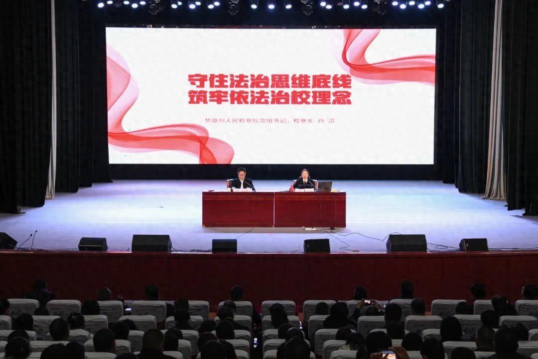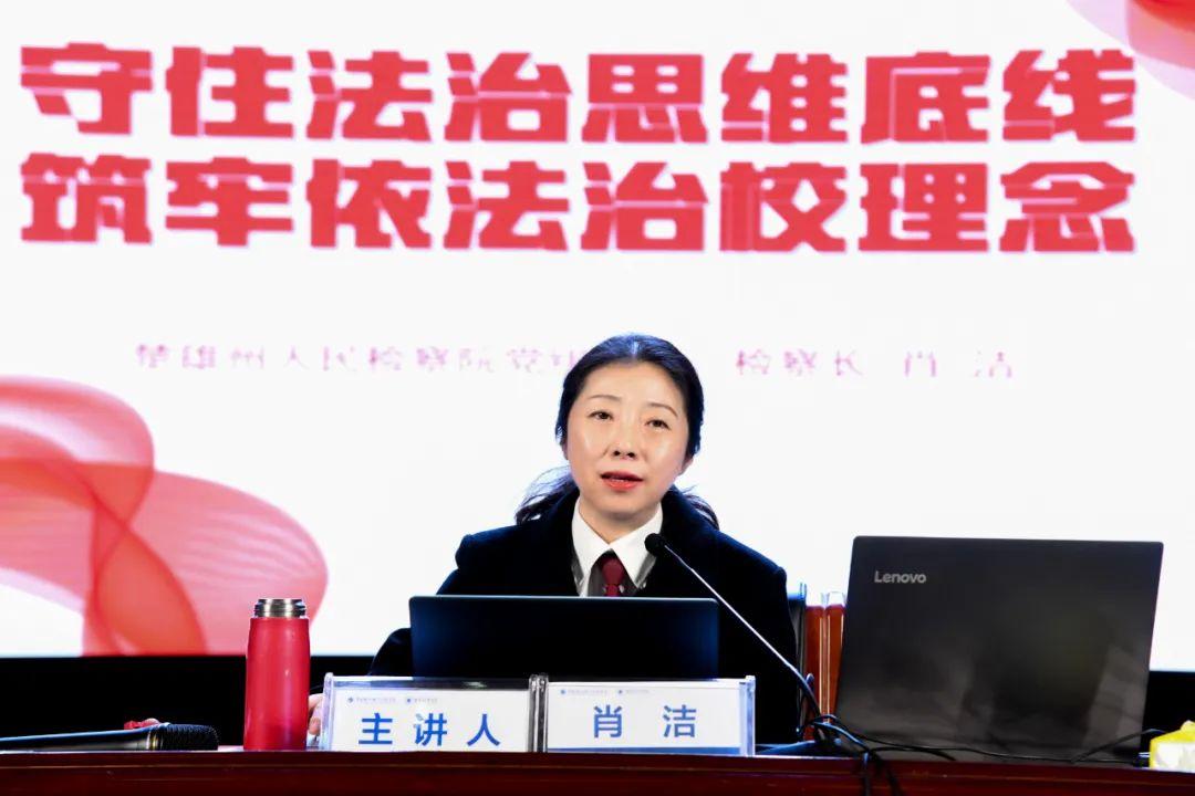12月15日下午 ,楚雄州人民检察院党组书记、检察长肖洁以法治副校长的身份,来到云南现代职业技术学院、楚雄技师学院,为学校600余名师生们带来了一堂主题为“守住法治思维底线 筑牢依法治校理念”的法治课。
