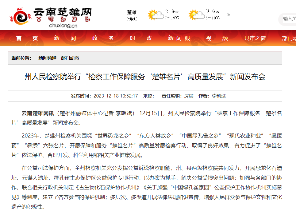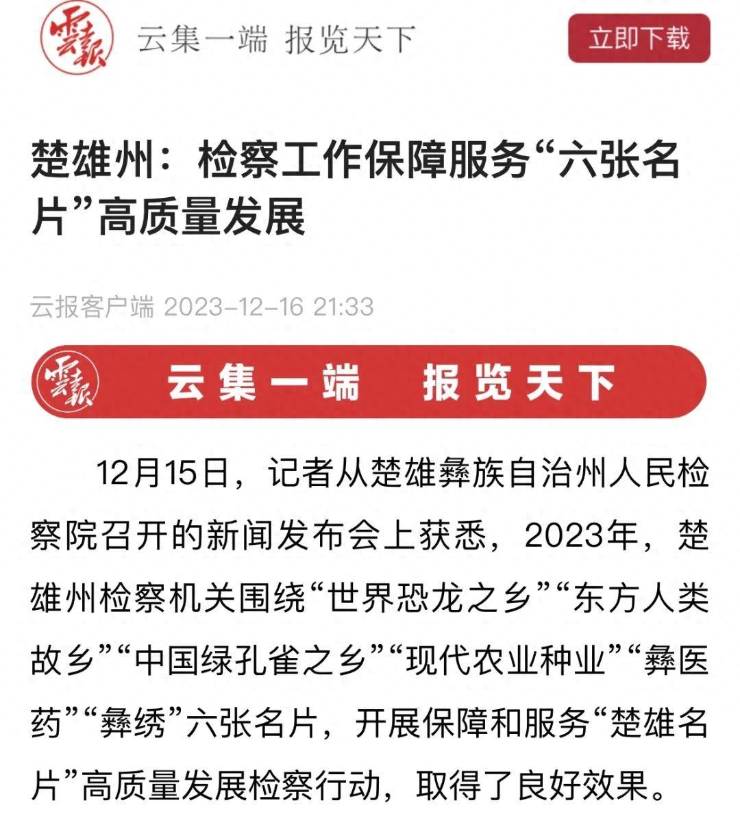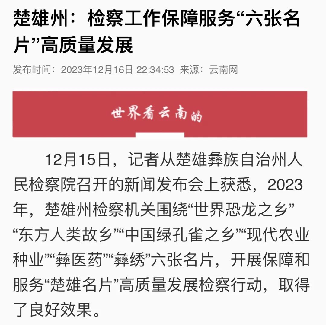 12月15日,记者从楚雄彝族自治州人民检察院召开的新闻发布会上获悉,2023年,楚雄州检察机关围绕“世界恐龙之乡”“东方人类故乡”“中国绿孔雀之乡”“现代农业种业”“彝医药”“彝绣”六张名片,开展保障和服务“楚雄名片”高质量发展检察行动,取得了良好效果。