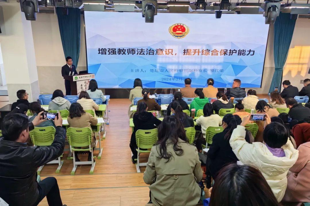 2024年春季学期开学之际,楚雄市检察院检察官为鹿城小学四个校区近300名教师上了题为“增强教师法治意识,提升综合保护能力”的“开学第一课”。讲座以“一号检察建议”为切入口,结合《民法典》为教师们讲解了在日常工作中应如何运用法治思维做好未成年人学生在校期间的安全管理工作,并结合日常生活中常见的热点问题,以丰富的案例向教师们介绍了预防校园性侵害的相关知识。通过此次授课,让教师们学到了许多法律知识,引导教师在工作、生活中都要树立法治思维,不去触碰法律的底线和纪律的红线,自觉做一名知法、守法、依法行教的“园丁”。