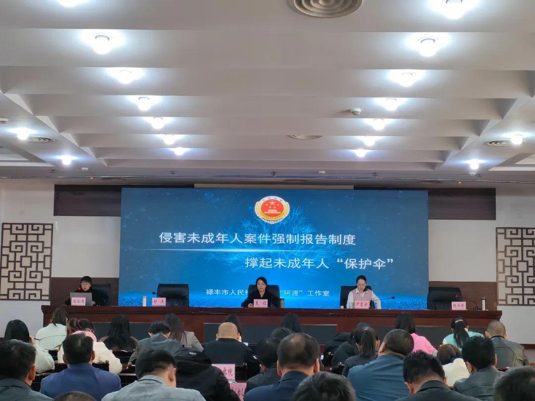 近日,禄丰市检察院“阿渡”工作室检察官给全市19家成员单位分管领导、14个乡镇分管领导、全市中小学、幼儿园校(园)长及市级医疗机构负责人进行强制报告制度专题宣讲。