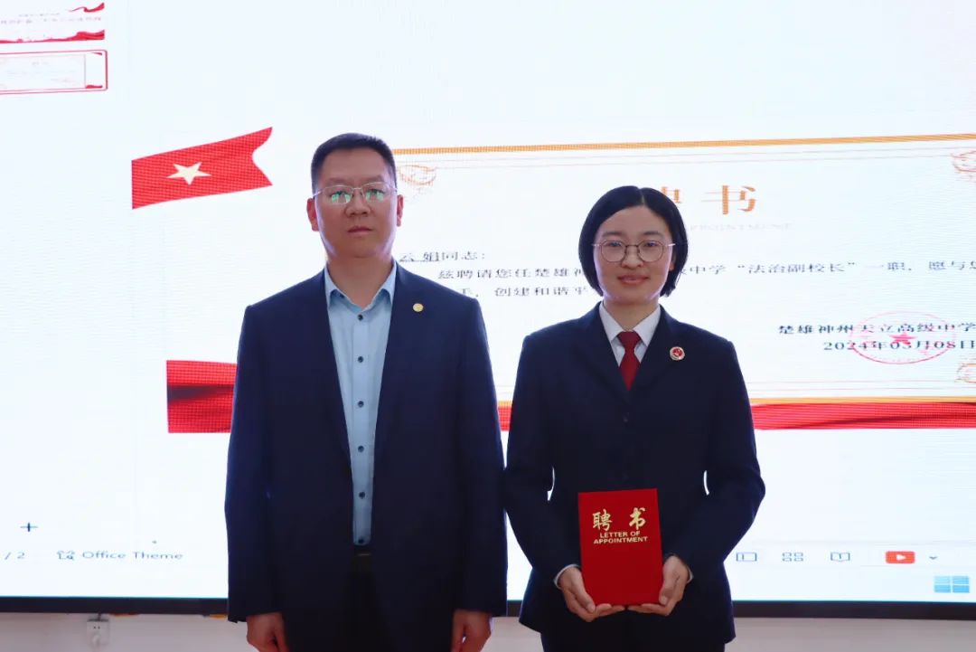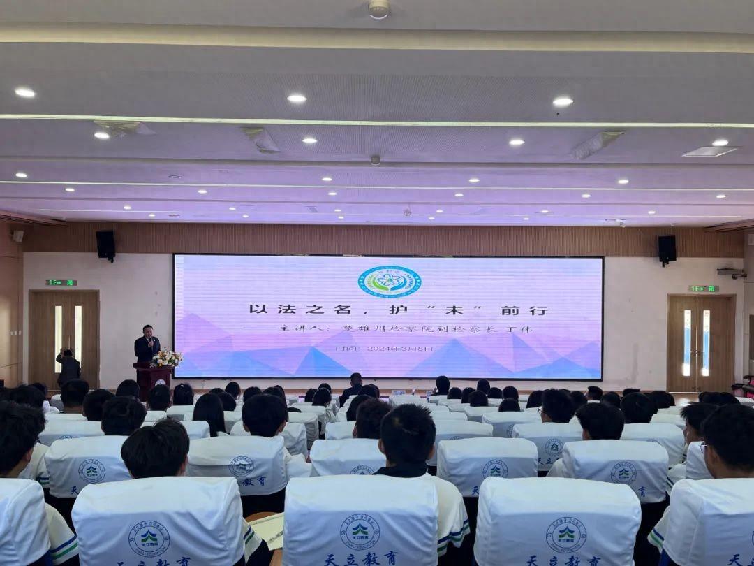 3月8日,楚雄州检察院副检察长丁伟一行走进楚雄市天立中学为近百名师生开展专题法治讲座,未检办主任云娟被聘为该校法治副校长。