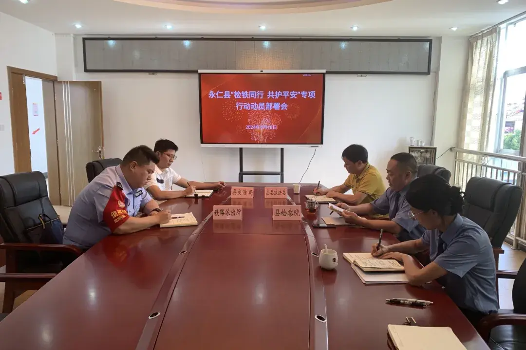 永仁县检察院召开“检铁同行 共护平安”专项行动动员部署会,就加强检察机关、政府、铁路运输企业协作配合,充分发挥公益诉讼检察职能,扎实推进铁路外部环境安全治理,助力维护铁路安全稳定、保障安全出行进行专门动员部署。
