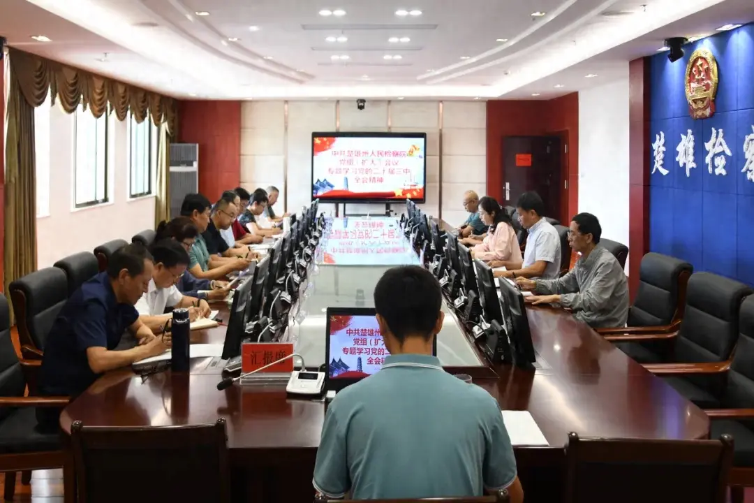 7月23日,楚雄州检察院召开党组(扩大)会议,传达学习党的二十届三中全会精神,研究贯彻落实意见。院党组书记、检察长肖洁主持会议。