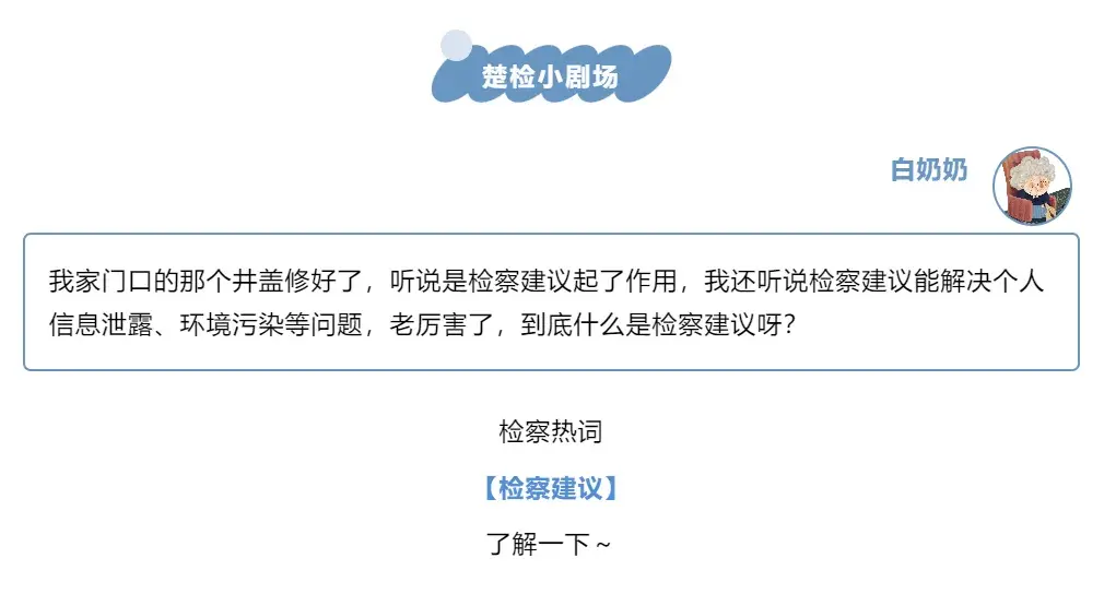 从“郝大爹”“小贾”到“白奶奶”,“楚检小剧场”扮演角色不断丰富,在不断创新人物角色和宣传影响同时,“楚检小剧场”通过有温度、有深度、有共鸣、有认同的方式,让群众真正了解检察机关的职能职责,才能更好地让普法“飞入寻常百姓家”。