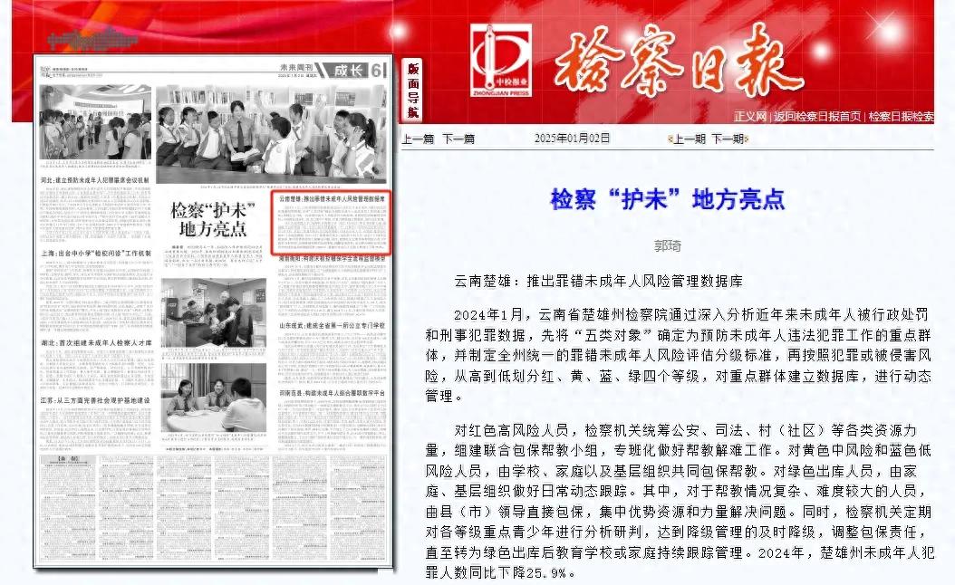 2024年1月,云南省楚雄州检察院通过深入分析近年来未成年人被行政处罚和刑事犯罪数据,先将“五类对象”确定为预防未成年人违法犯罪工作的重点群体,并制定全州统一的罪错未成年人风险评估分级标准,再按照犯罪或被侵害风险,从高到低划分红、黄、蓝、绿四个等级,对重点群体建立数据库,进行动态管理。