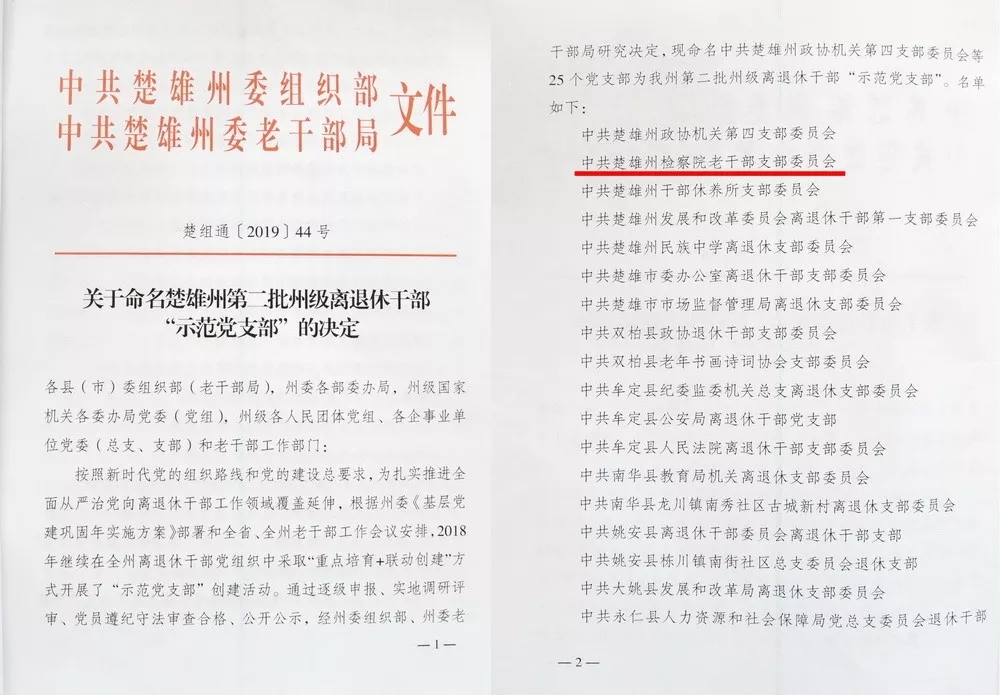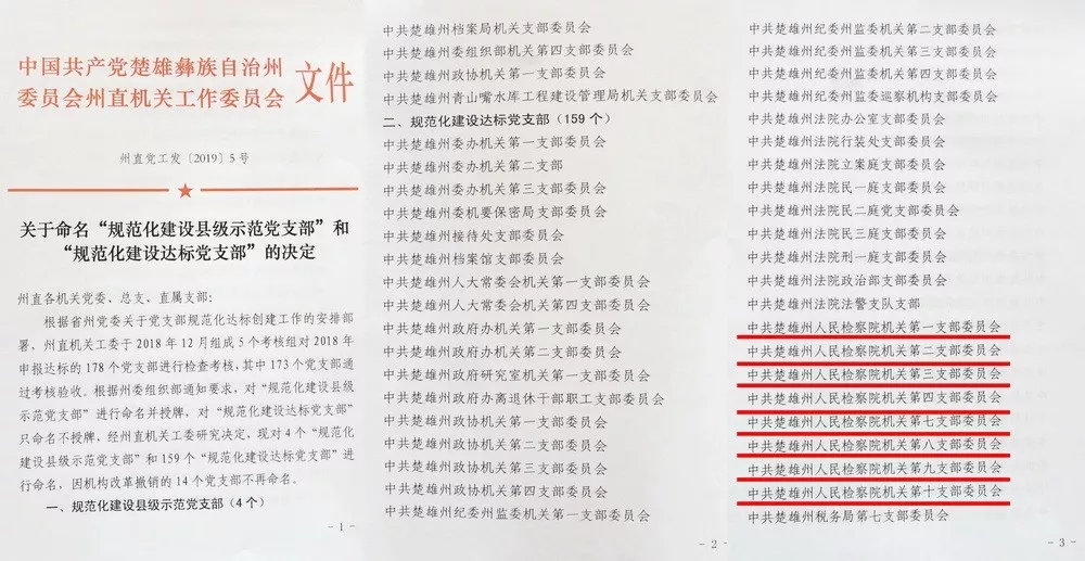 近日, 在中共楚雄州委州直机关工委下发的《关于命名“规范化建设县级示范党支部”和“规范化建设达标党支部”的决定》中,楚雄州人民检察院机关8个党支部全部被命名为“规范化建设达标党支部”。与此同时,在州委组织部、州委老干局近日下发的《关于命名楚雄州第二批州级离退休干部“示范党支部”的决定》中,楚雄州人民检察院机关第十党支 部还被命名为州级离退休干部“示范党支部”。