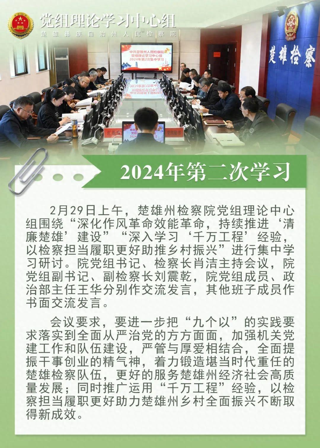 2月29日上午,楚雄州检察院党组理论中心组围绕“深化作风革命效能革命,持续推进‘清廉楚雄’建设”“深入学习‘千万工程’经验,以检察担当履职更好助推乡村振兴”进行集中学习研讨。