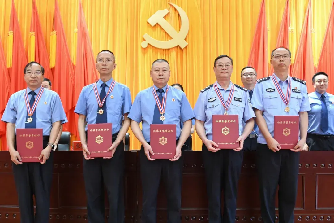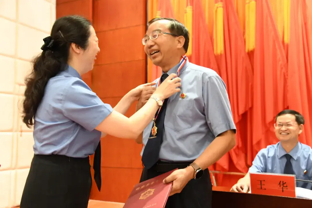 会上,院党组书记、检察长肖洁为州院今年从检满30年的华明昌、金永红、王德云、张荣平、杨应彩5名同志颁发“从检30年检察荣誉章”和证书,全体干警以热烈掌声向他们表达崇高的敬意和诚挚的祝贺。一枚荣誉章,三十载检察情,感谢他们对检察事业30年来的支持和付出,希望他们一如既往坚守检察初心,发挥好“传帮带”作用,为检察事业继续发光发热。