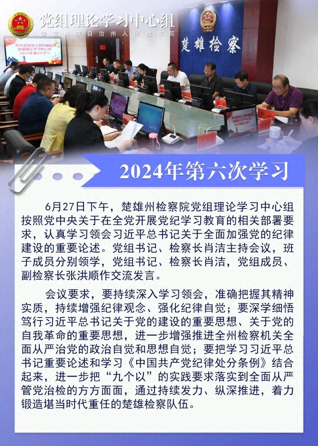 6月27日下午,楚雄州检察院党组理论学习中心组按照党中央关于在全党开展党纪学习教育的相关部署要求,认真学习领会习近平总书记关于全面加强党的纪律建设的重要论述。