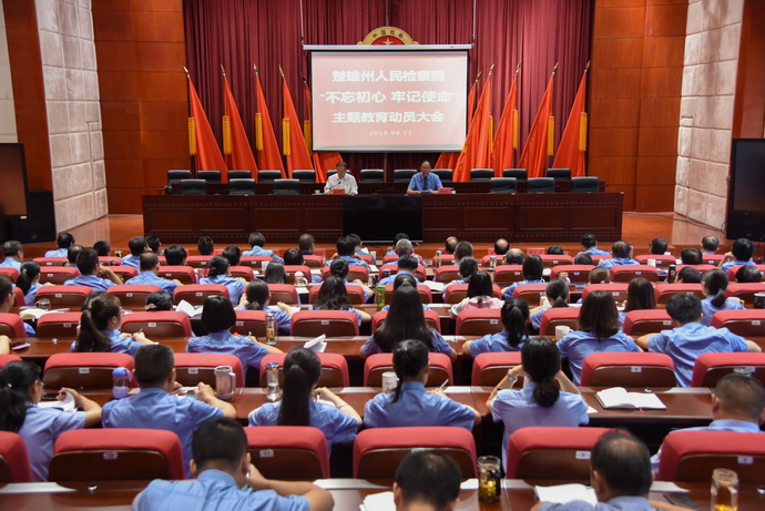 9月17日上午,楚雄州人民检察院召开“不忘初心、牢记使命”主题教育动员会议。州委第十五巡回指导组组长周国兴、副组长严万雄、成员李晓波、朱欣婧到会指导,州检察院班子成员及全体干警参加会议。州检察院党组书记、检察长普赵辉主持会议。