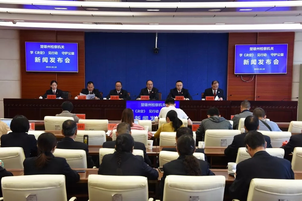 2019年10月10日上午,楚雄州人民检察院同全省检察机关同步召开“学《决定》,见行动,守护公益”主题新闻发布会,专题发布楚雄州检察机关充分履行公益诉讼检察职能,切实服务和保障楚雄生态文明建设的有关情况。云南日报、云南法制报、民族时报、环球游报、楚雄州广播电视台、楚雄日报、云南楚雄网、楚雄政法新媒体中心8家省、州媒体记者参加发布会。楚雄州人民检察院党组成员、副检察长李光俊进行新闻发布,州检察院第八检察部负责人刘晓波,楚雄市人民检察院党组书记、检察长李全华,禄丰县人民检察院党组书记、检察长刘和贵,大姚县人民检察院党组书记、检察长普应聪出席发布会并回答记者提问,州检察院相关部门、部分县(市)院公益诉讼部门干警到场聆听。