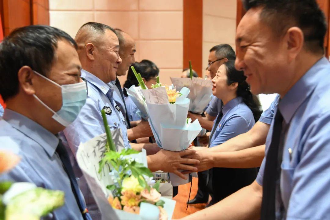 肖洁检察长致辞并代表全院检察干警向9名即将退休的检察干警表示祝福和感谢,希望他们继续为检察事业的发展建言献策,同时号召全体检察干警握紧握牢“接力棒”,以更强的责任担当推动检察工作取得更大成就。院领导向即将退休的干警和默默支持他们工作的家属献上鲜花,并赠送了纪念相框。