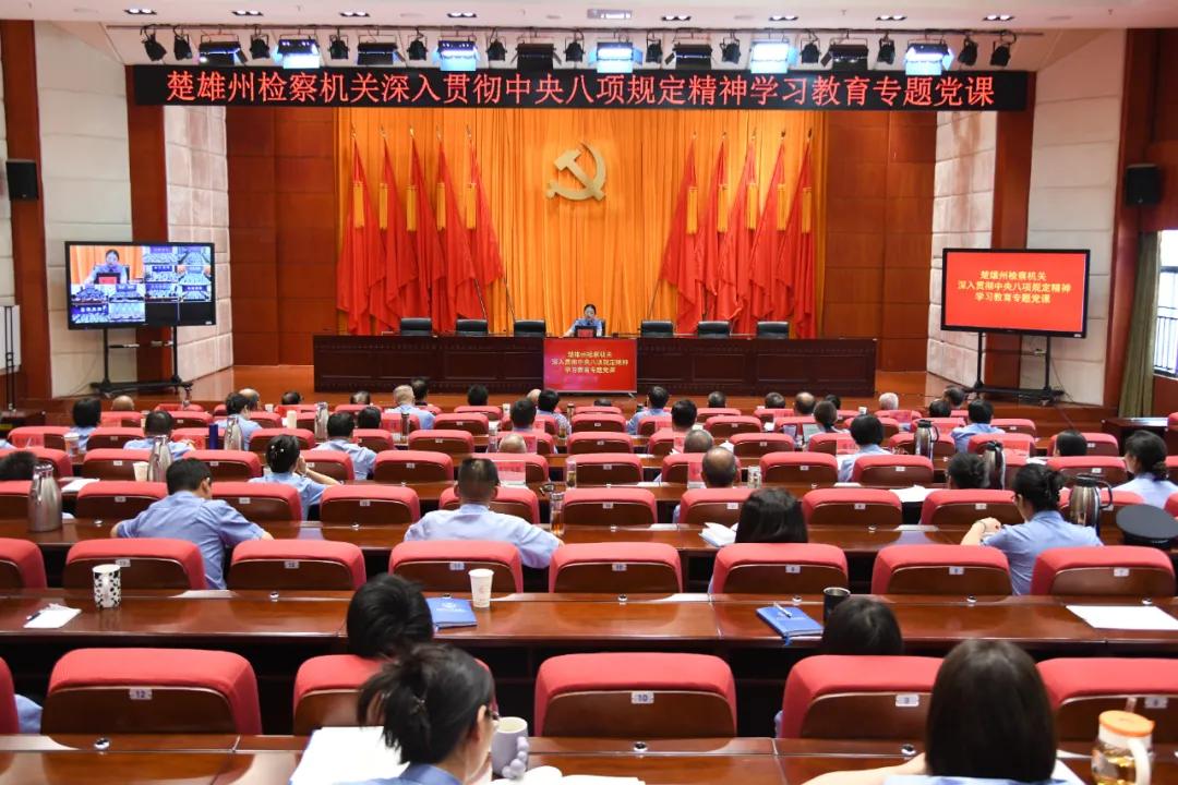 院党组书记、检察长肖洁为全州全体检察人员讲授深入贯彻中央八项规定精神学习教育专题党课,系统阐述了中央八项规定精神的重大意义和核心要求,深入分析了当前作风建设面临的形势和挑战,结合中央、省州通报的违反中央八项规定精神的典型案例和发生在检察系统的违规违纪违法案例深入剖析,教育引导全体检察干警以案为鉴、汲取教训,真正做到心有所畏、言有所戒、行有所止。